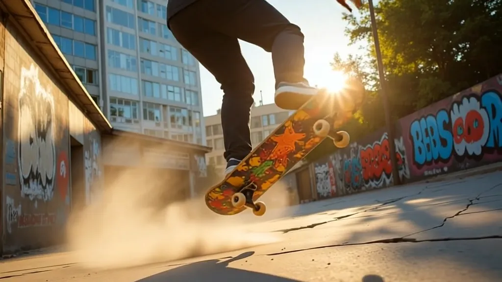 A skateboarder executing a perfect kickflip in mid-air, sunlight illuminating dust particles, gritty urban backdrop, detailed skateboard graphics, dynamic motion blur, hyperrealistic rendering, 8k resolution, cinematic lighting.