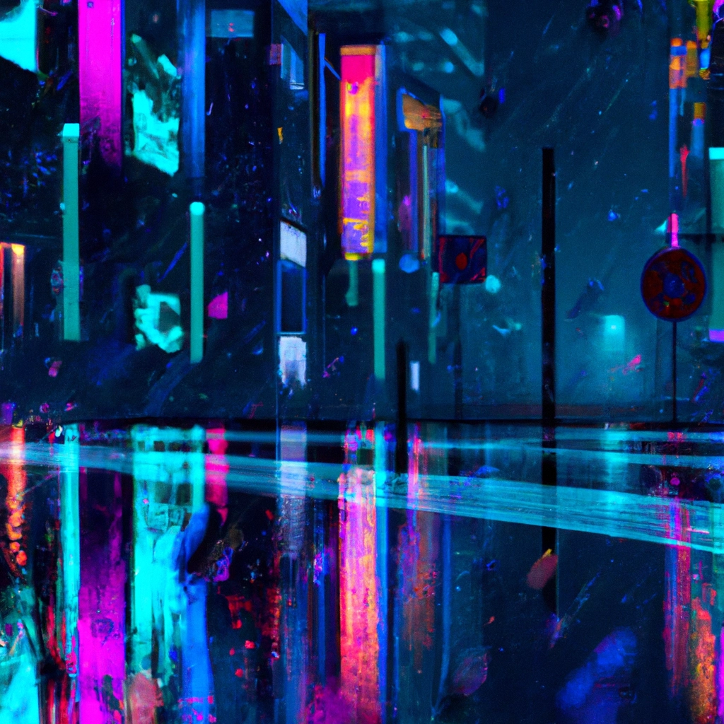 Digital concept art of a neon cyberpunk city at night, rain reflections, vibrant neon lights, high detail