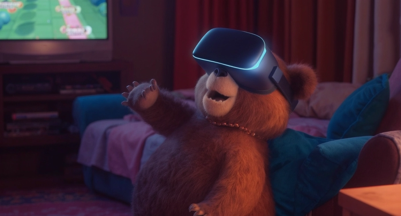A little bear is wearing an HMD and having fun playing a VR game in his room