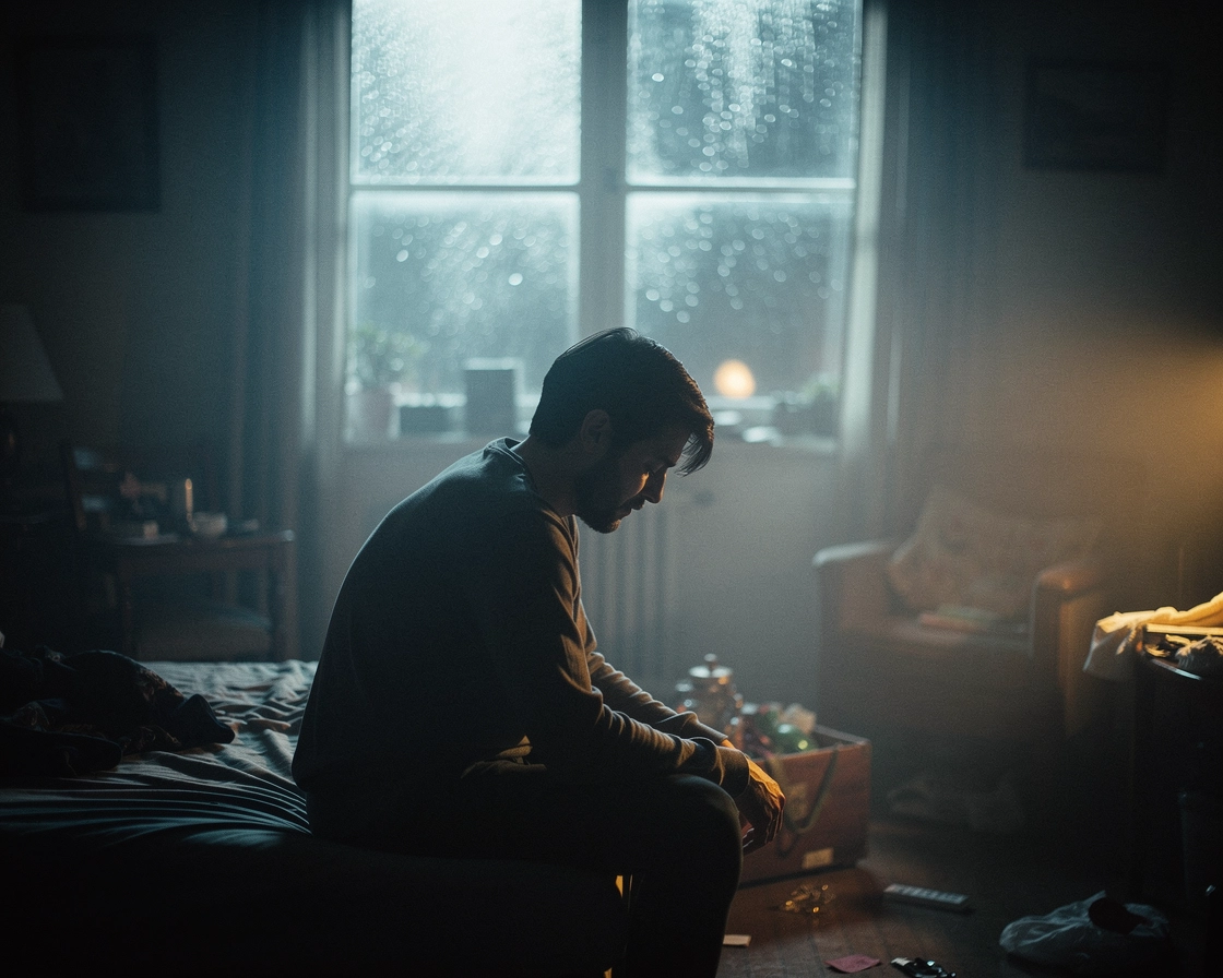 cinematic still frame, moody atmosphere, volumetric lighting, dramatic shadows, film-grain texture, 35mm lens look, deep contrast, soft rim light, emotionally expressive scene, high dynamic range, realistic color tones