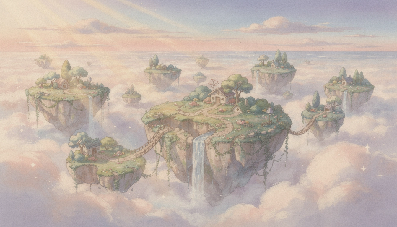 Dreamy pastel fantasy landscape, floating islands, soft clouds, gentle sun rays, misty horizon, ethereal ambiance, painterly textures, Studio Ghibli + watercolor fusion, calming color palette, detailed environment, magical realism