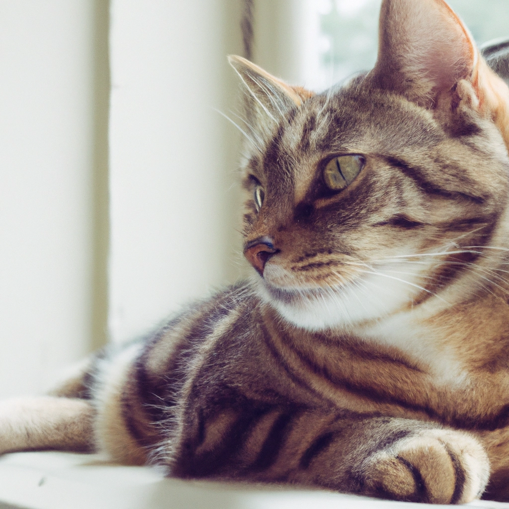 A photorealistic photograph of a tabby cat lying on a windowsill, natural morning light, shallow depth of field, crisp detail