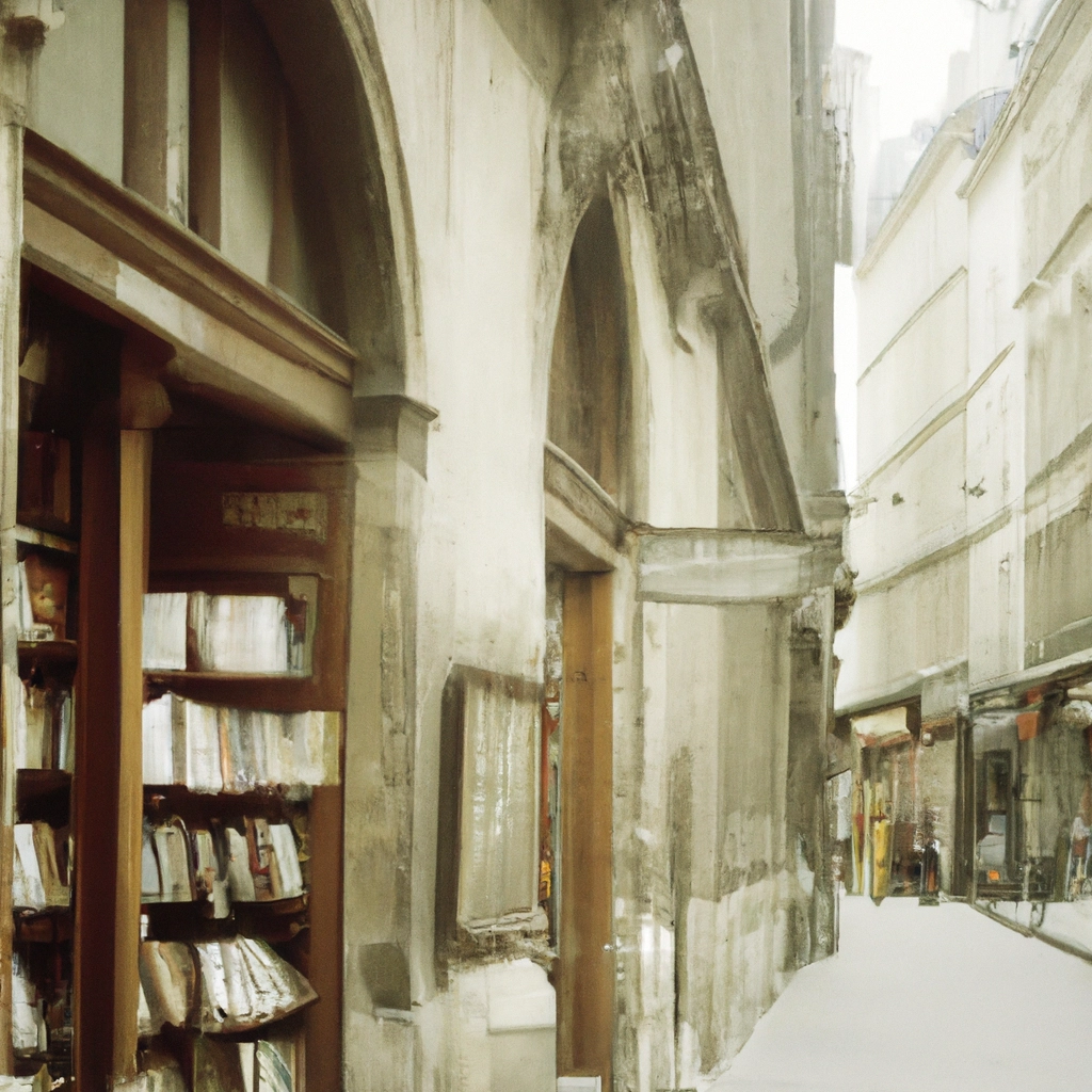 Vintage film photograph of an old bookstore street in Paris, soft pastel tones, subtle grain, warm nostalgic mood