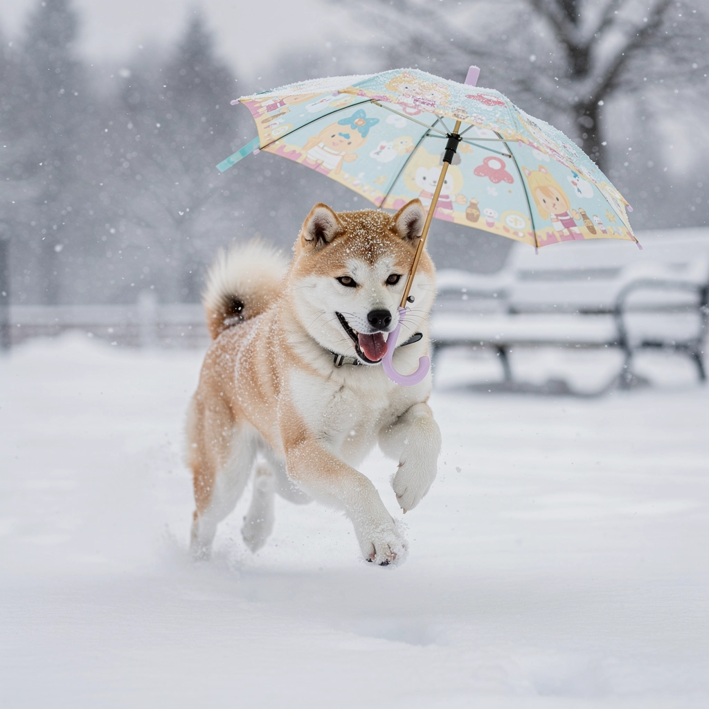 눈 오는날 우산을 쓰고 뛰어노는 진돗개 강아지