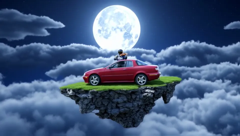 An astronaut playing a violin while sitting on a red car, floating on a rocky platform above the clouds at night. The full moon glows brightly in a starry sky, with thick, dramatic clouds surrounding the scene. The mood is ethereal, serene, and cinematic, with soft lighting and slow atmospheric motion. A surreal dreamscape blending space exploration with classical music in the sky.